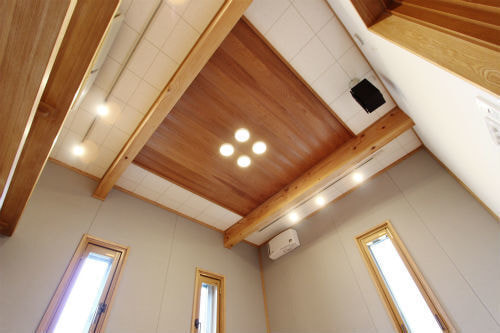天井は、デザイン性という観点から、上り梁を化粧で見せています。真ん中には、無垢の米杉を貼りました。その周囲の白い部分は、吸音材になっています。