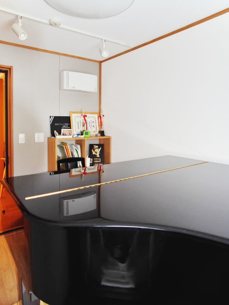 このように、防音室を設計するには、遮音性能と音響が大切です。今回は、吸音仕上げ材と珪藻土の塗り壁を、ピアノの位置も配慮して、バランスよく配置して、響きを残しつつ、吸音するという方法をとっています。