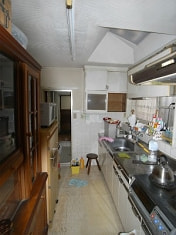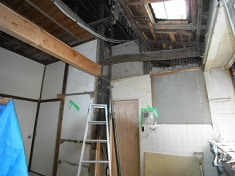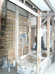 工事中:キチンを少し広くするために壁を壊し、新しい梁を入れています。