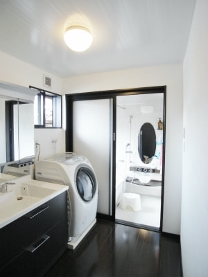 ダークブラウンと白のコントラストがきれいな脱衣場・浴室です。
