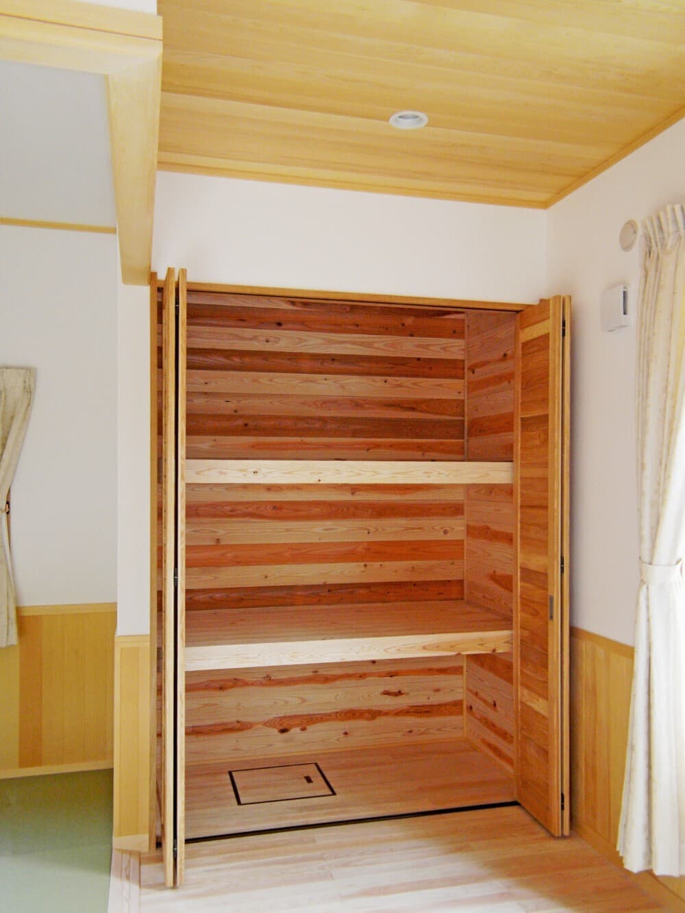 クローゼットの中はすべて木です。このようにすると、中に座布団や布団を入れてもカビ臭くなりません